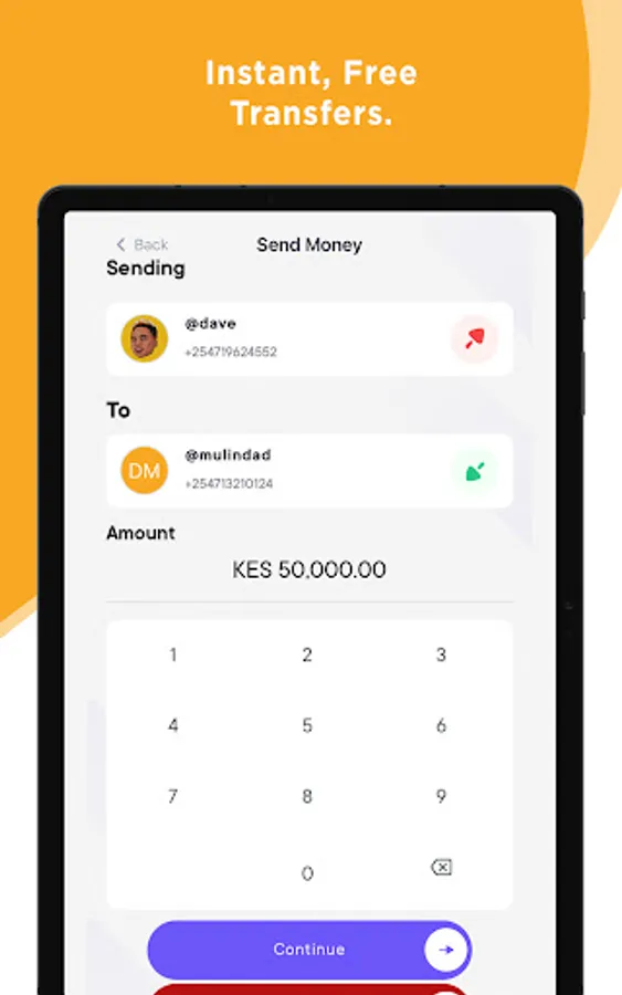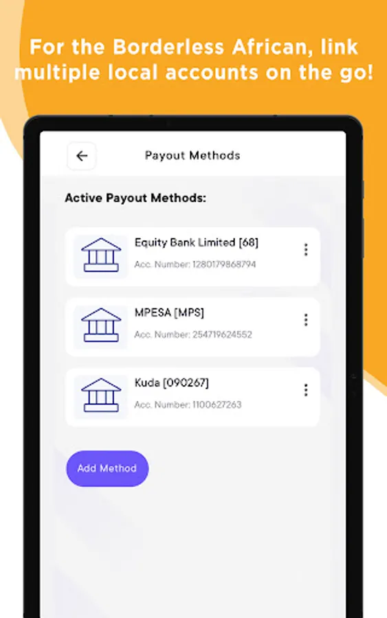-Hold and exchange seven different currencies: KES, GHC, TZS, NGN, RWF, UGX & USD, EUR