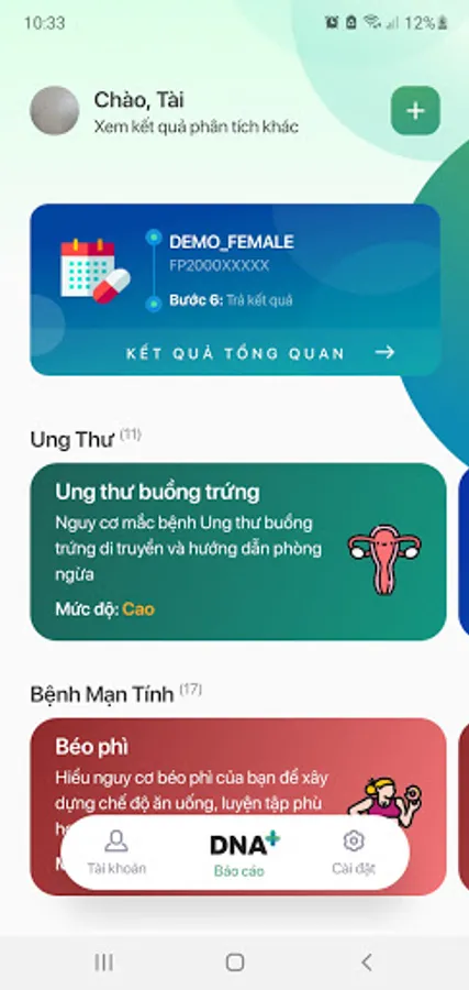 Based on your Whole Exome Sequencing testing results, DNA+ create personalized genetic reports that will help you screen cancer and chronic disease risks, manage your disease risks and discover your hidden personality traits. Get DNA+ app, you are updated with the latest genetic disease database, access to Vietnamese disease database (7000+ diseases) and easy to track your testing status.