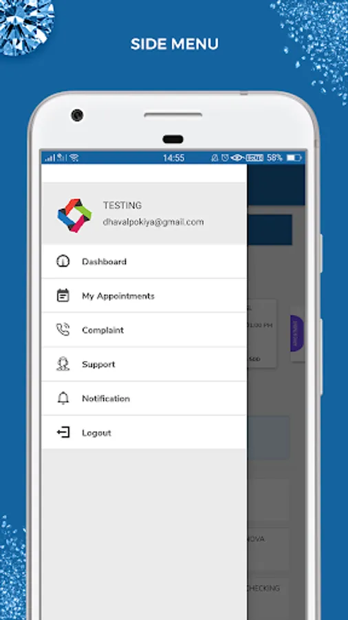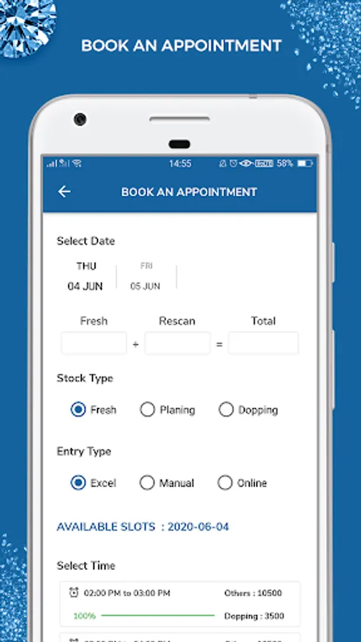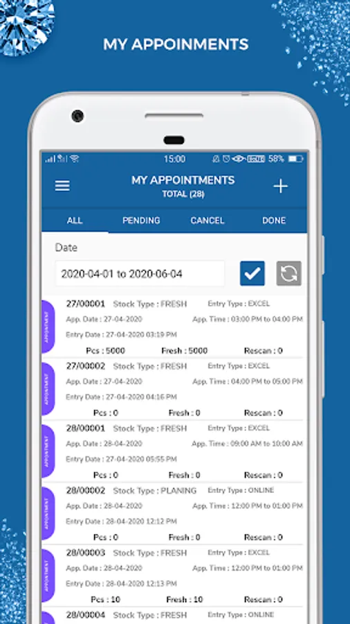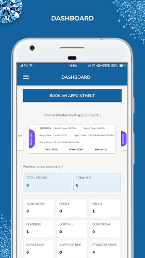 In this application customer can easily see his inventory status in dashboad and also book appointment for inward the diamond for jobwork