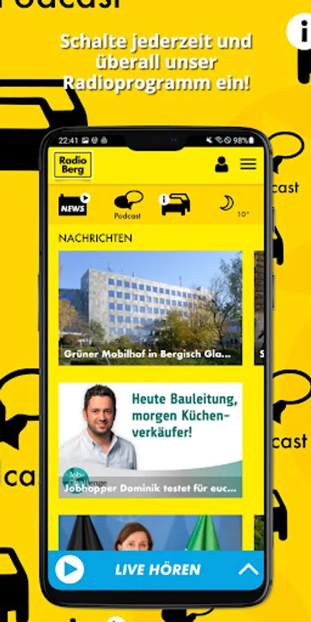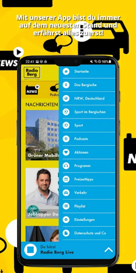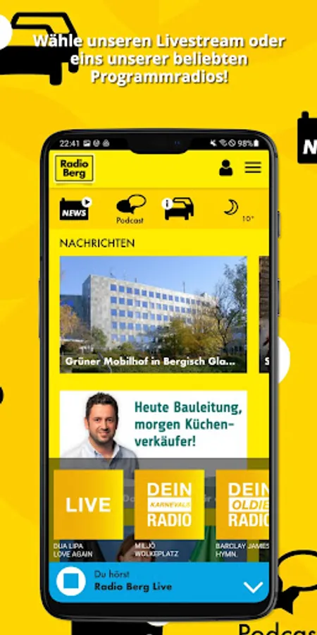 With our app you always stay up to date. We bring all information from the Bergisch region to your smartphone. Current news, information about the program, events and promotions. Listen to the program via our livestream or select one of our channels.