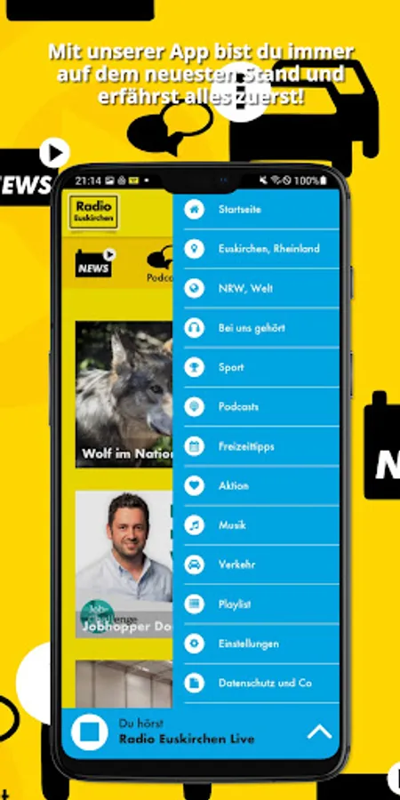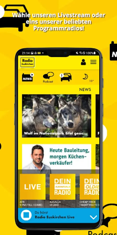 With our app you always stay up to date. We bring all information from the district of Euskirchen to your smartphone. Current news, information about the program, events and promotions. Listen to the program via our livestream or select one of our channels.