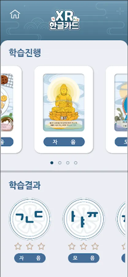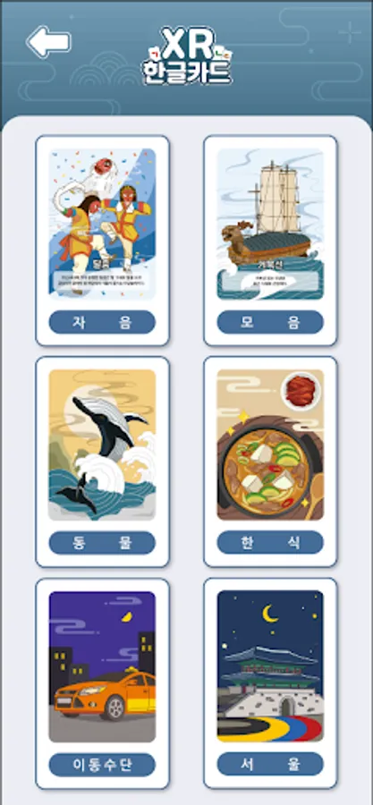 . 한글을 배우기 위한 기초 자음/모음/쌍자음과 한국을 대표하는 상징을 낱말카드로 구현되어 있습니다.