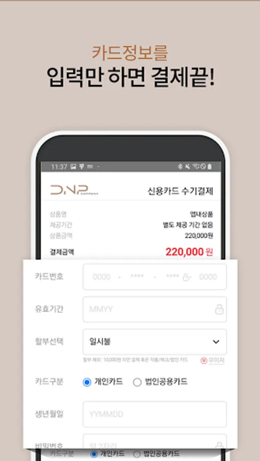 1. Manual payment: This is a service that allows you to easily pay by card with your card number/expiration date (customers can pay immediately without having to sign up for membership or install an app/certificate)