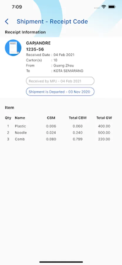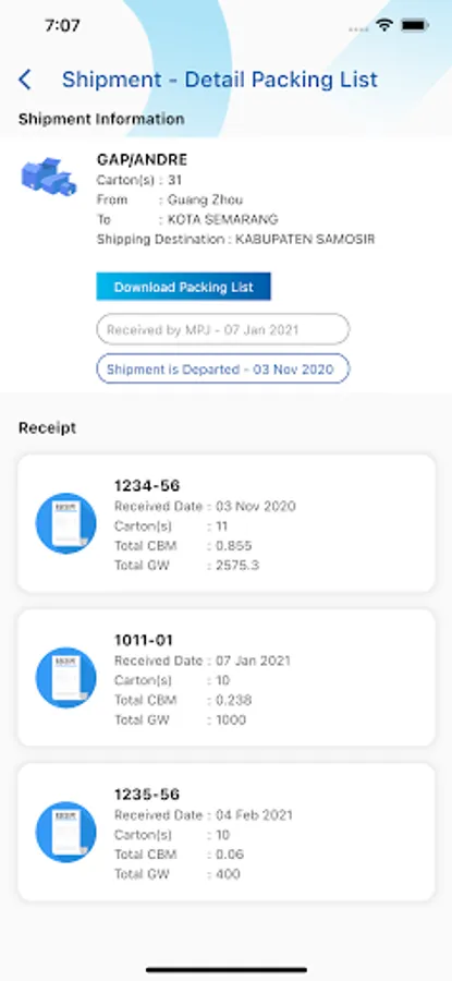 In MY Cargo Apps, customer can find latest information regarding shipment broadcasted by CV Mandiri Prima Jaya.