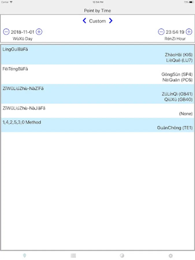 1. This software provides LingGuiBaFa, FeiTengBaFa, ZiWuLiuZhuNaZiFa and ZiWuLiuZhuNaJiaFa for chrono-acupuncture open points.