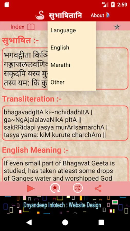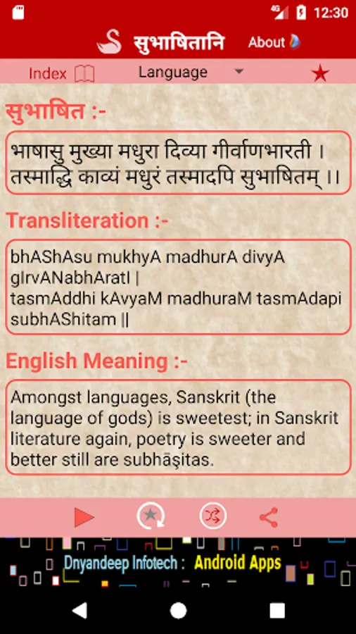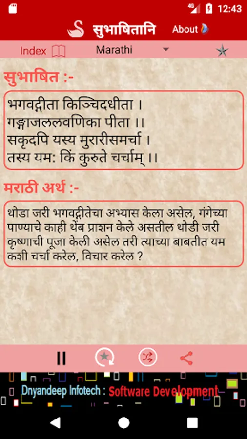 The app helps you recite the shlokas by playing audio clips repeatedly. Shlokas can be bookmarked and shared. Bookmarked shlokas can be displayed and played in sequence. The shlokas can be shuffled or selected/searched from index list.