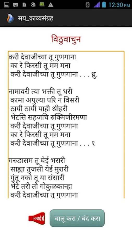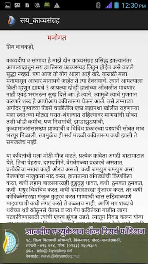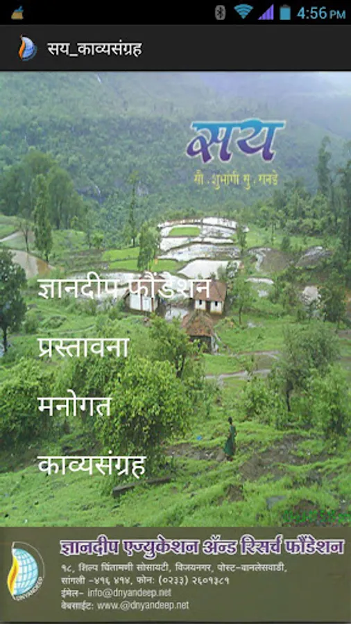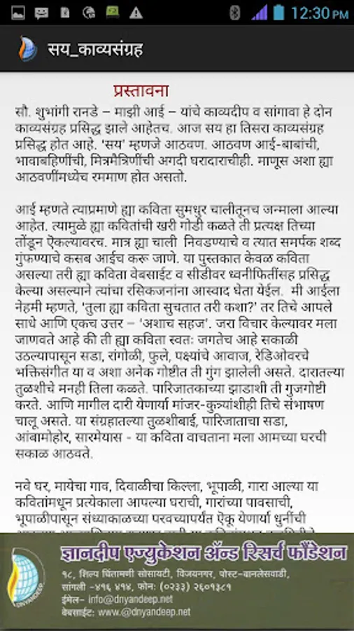 There are 50 Marathi poems written by Mrs. Shubhangi Ranade with her own audio clips for all poems. Earlier she has published two such books viz. Kavyadeep & Sangava. The poems exhibit emotional relationships and perceptions of poet about nature & society.