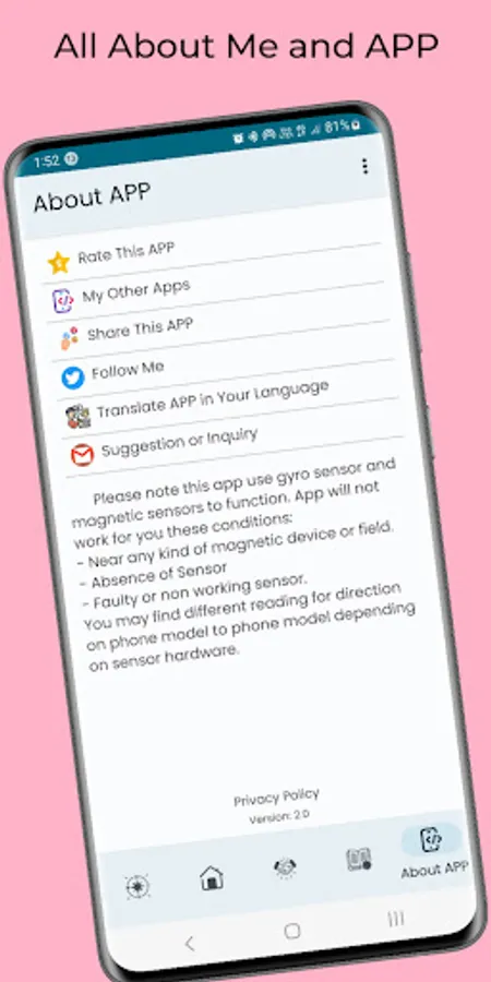 Please note this app use gyro sensor and magnetic sensors to read directions, if your mobile phone not build with gyro sensor this will not work for you. also note any kind of magnetic device or field can affect results.