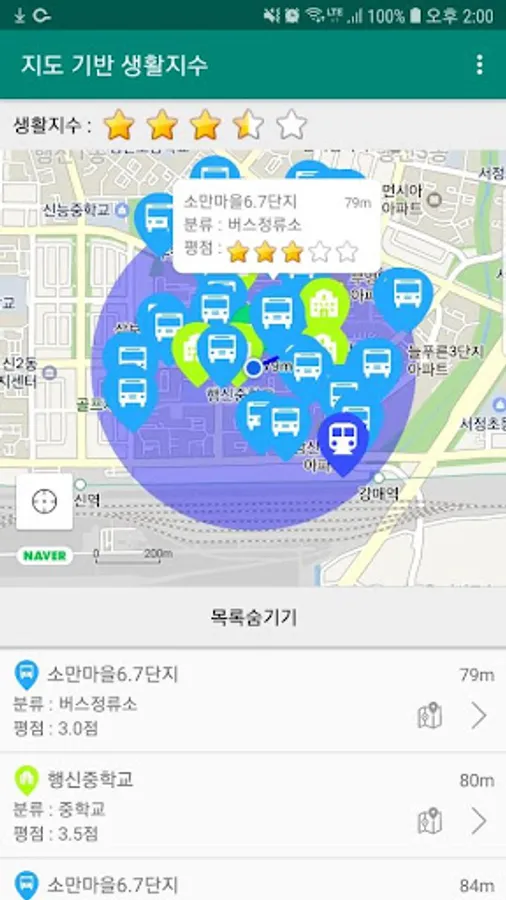 2. Selecting the indicated nearby facilities will display detailed information and average scores for the selected facilities.