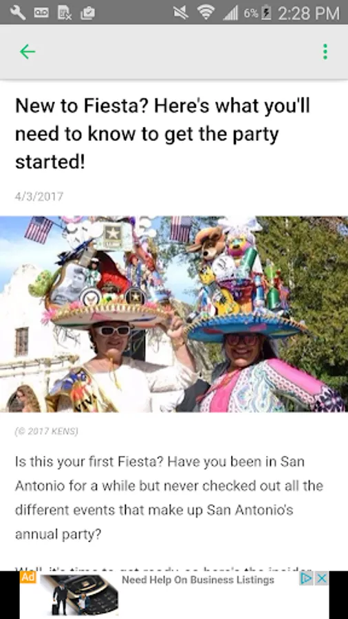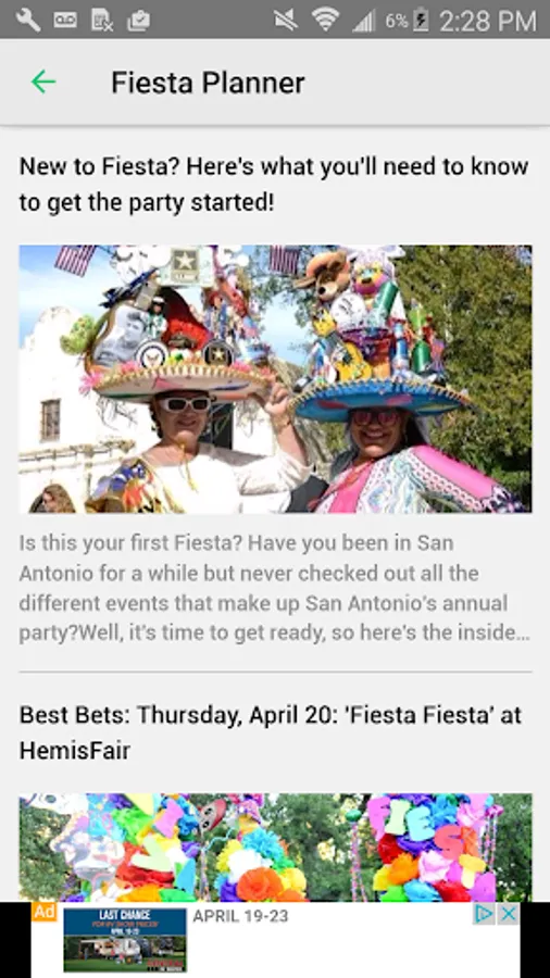 San Antonio's Fiesta is an 11-day celebration of local culture that includes parades and pageantry, festivals and fun... and so much food! The "KENS 5 Fiesta Coverage" app will help you enjoy the best of Fiesta! Find a Fiesta event to attend based on date and location and check out photo slideshows of all the fun times, then share your own! You can even check the weather and traffic conditions! Viva FIesta!