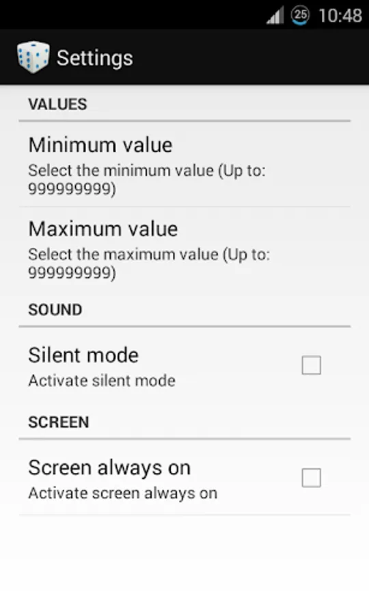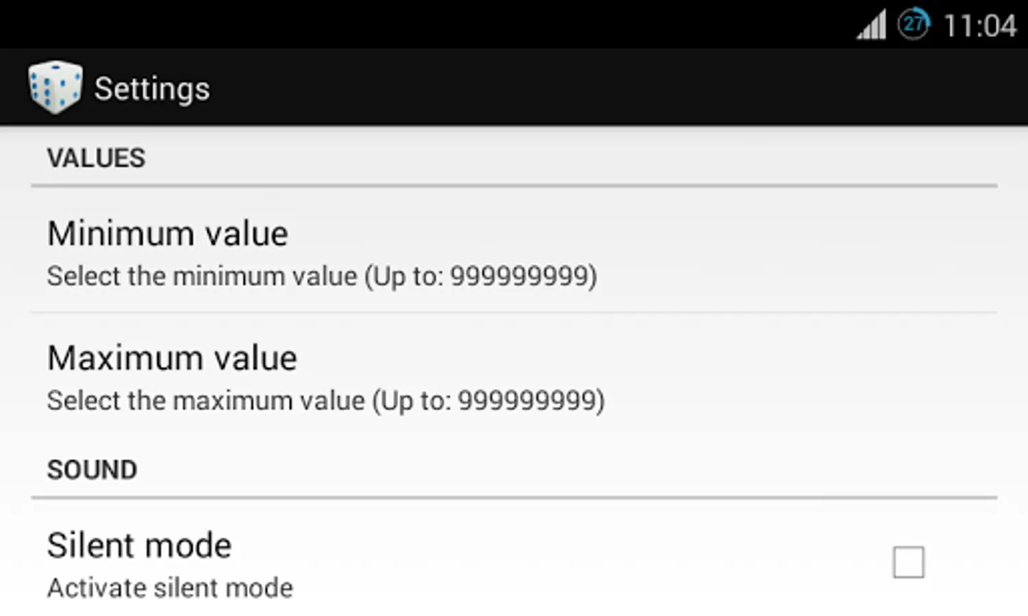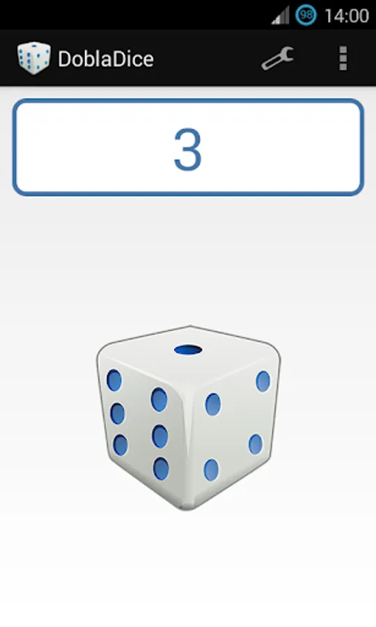 DoblaDice provides you with an essential bag of dice: D2, D3, D4, D5, D6, D7, D8, D10, D12, D14, D20, D24, D30, D100, etc. in your tablet or smart-phone. You can configure this app to get any kind of dice you imagine, usual or unusual. Just enter in the configuration option and set the values (minimum/maximum) for your dice and play. You will get a random number between those two values.
