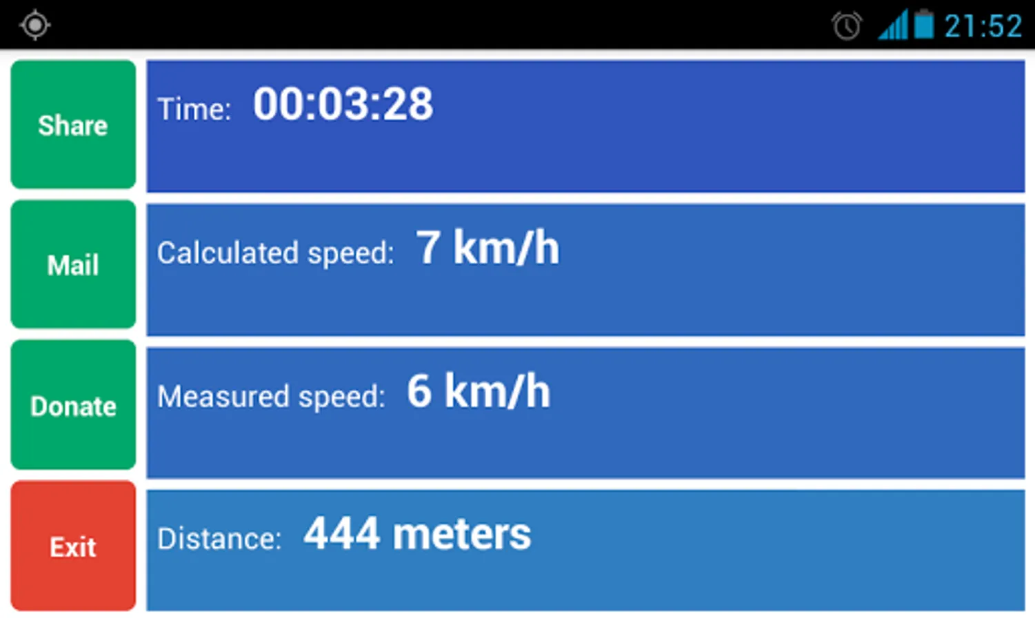 Cycle, run, jog, or simply walk with this easy app and get information about time, speed and distance as well as your GPS location and route in Google Maps. After finishing your fitness activity you get a summary with your route which can be exported in KML-format (used by Google Earth). You can also send all the information by email or share it with your friends through the social networks (such as Facebook, Twitter or Whatsapp)
