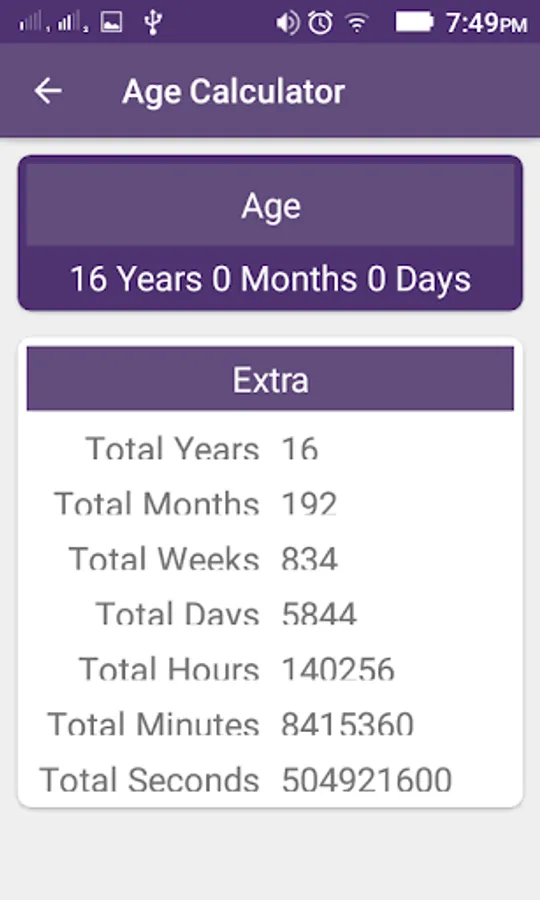 The Age Calculator is a free and light-weight, fast and easy to use app to calculate your chronological age and find total years, months, days, weeks, hours, minutes and seconds between two dates, and also it is useful to find date difference between two dates like wedding anniversary, work anniversaries, events, etc...