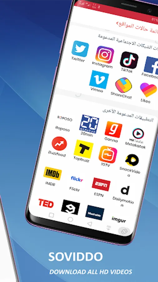 You can get the Soviddo application to download videos from FACEBOOK, TIKTOK, LIKEE, INSTAGRAM, TOP BUZZ, TWITTER, WHATSAPP STATUS and more, with downloading and saving videos from the latest news, pages, groups, friends and more. You can download high quality videos in just a few simple steps and look at the history list.