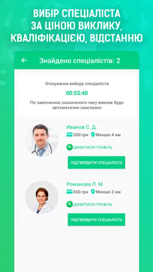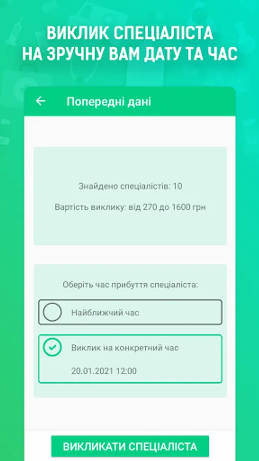 - Just open the program and tell us which specialist you need, when and where he needs to come.