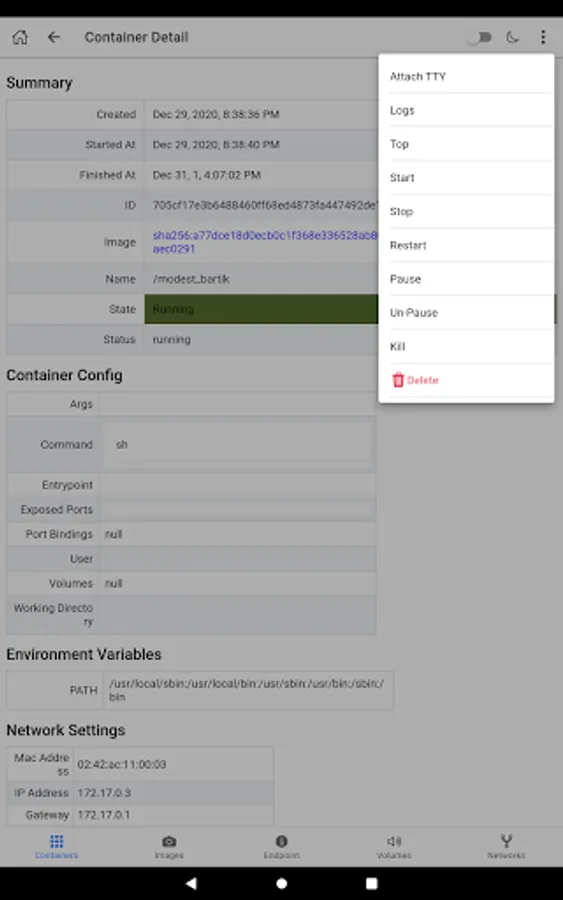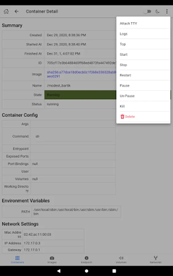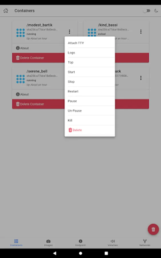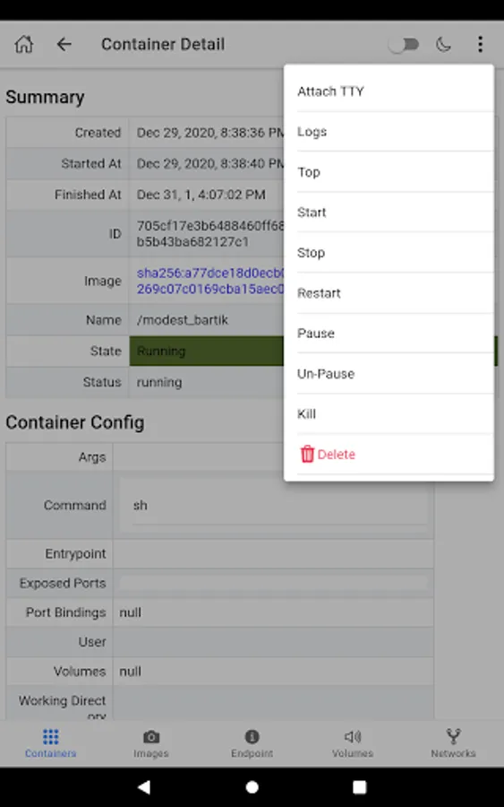 - Start/stop/pause/unpause/delete container