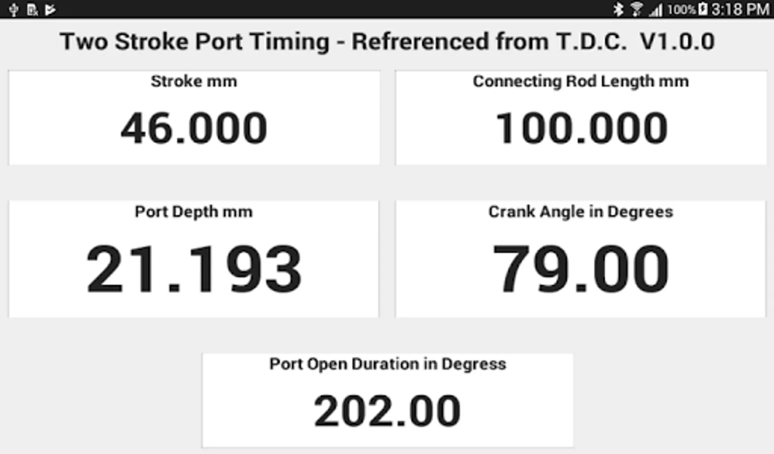 Two Stroke Port Timing Calculator allows you to relate crank angles to piston stroke position relative to T.D.C.