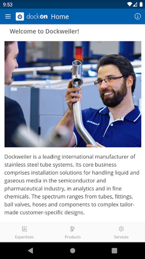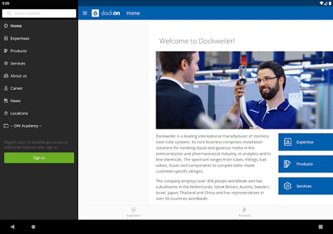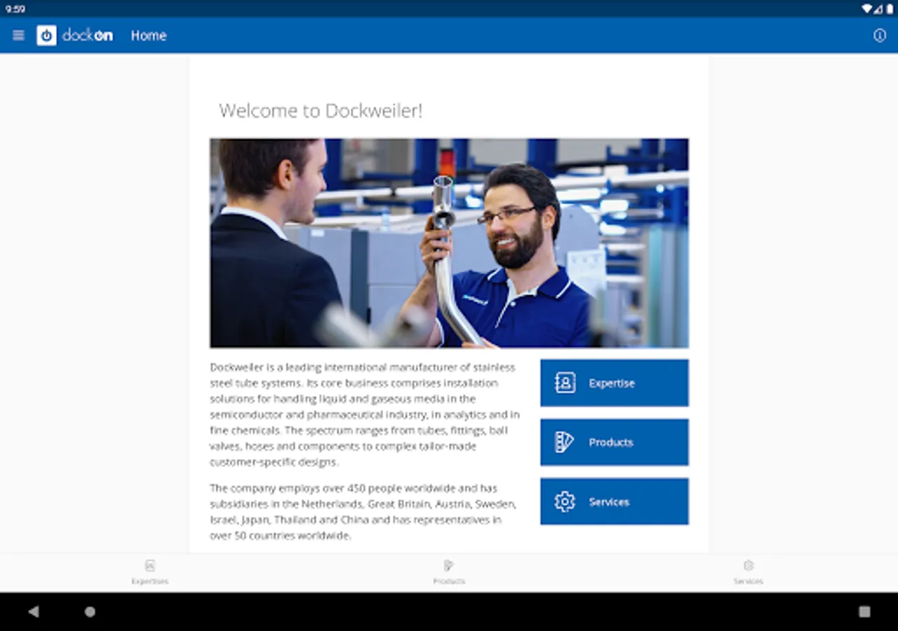 The dockON-App is the global communication platform of Dockweiler AG. Dockweiler is a leading international manufacturer of stainless steel tube systems. The core business is the development of installation solutions for handling fluid and gaseous media in the semiconductor, pharmaceutical, analytical and fine chemistry industries. Our portfolio includes tubes, fittings, ball valves, hoses, components as well as complex customer-specific special designs.