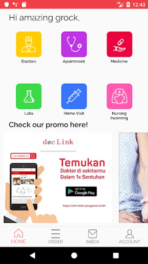 Beragam? Layanan mulai dari: pemeriksaan dan tindakan dokter, pelaksanaan fisioterapi, pemeriksaan kandungan oleh bidan dan perawatan rumah oleh perawat, tersedia dalam satu aplikasi dan dapat digunakan oleh pengguna dimana saja.