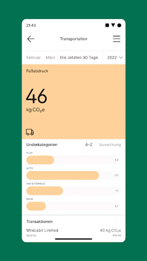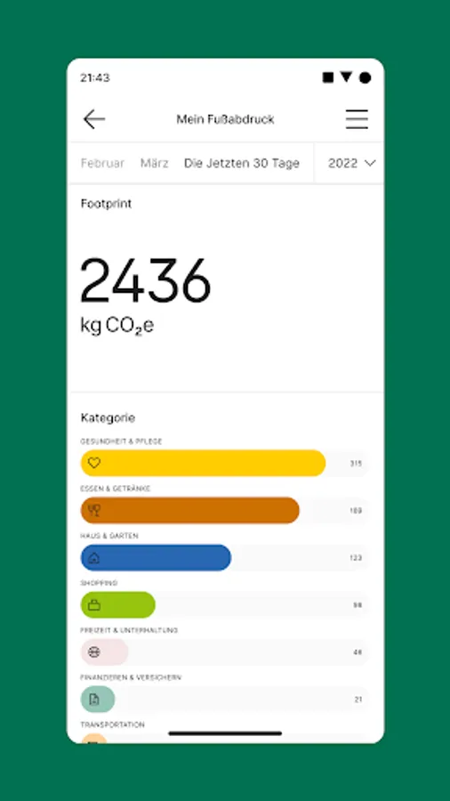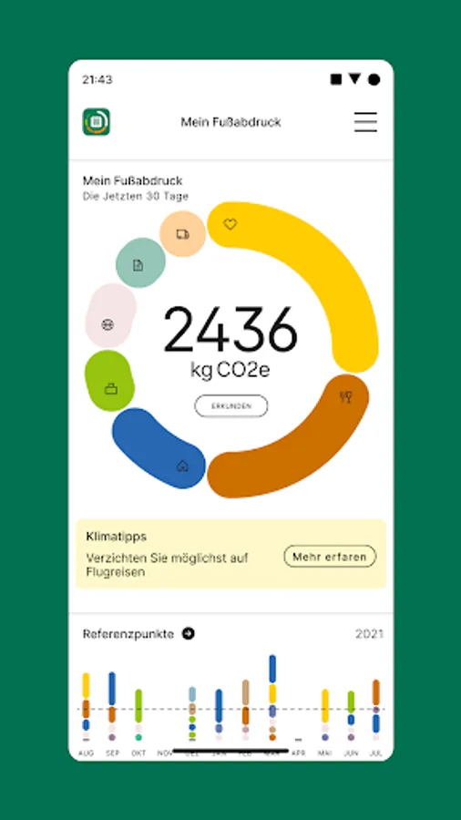By using the app you can calculate your personal carbon footprint to strengthen your climate awareness. The OLB Klimascore tracks your impact on the environment based on the bank transactions. The app gives you a clear summary of your own behaviour on a monthly basis.