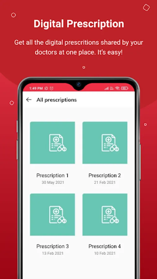 Prescription and medical document management - You get one-touch access to your Health Records anytime anywhere. All your uploaded medical documents and prescriptions shared by doctors are saved securely with us. You can easily share your records when asked by your Doctor in just one click and experience hassle-free teleconsultation.