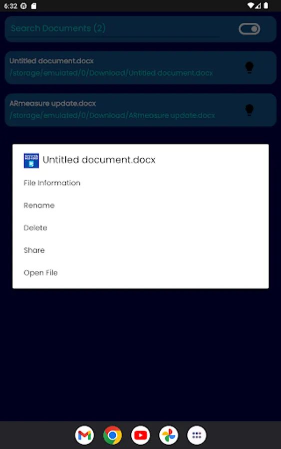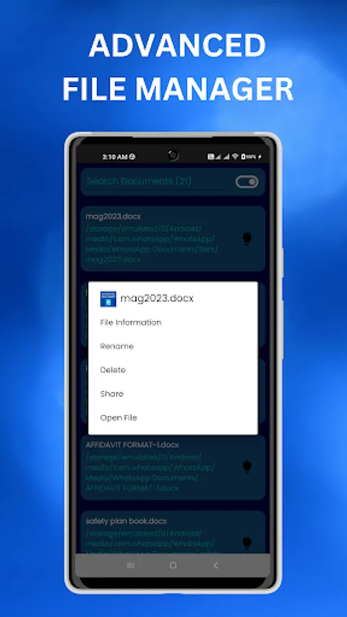 8. Stay organized with updated information about your word docx files thanks to document manager that displays information, rename docx, delete docs, share doc, has docx editor for name of word file, allowing you to open office word documents easily.