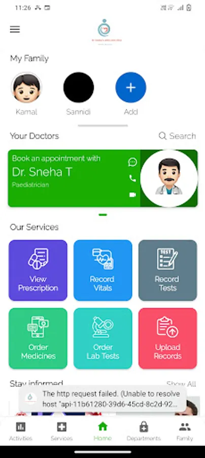 Welcome to Dr Sneha's Child Care Clinic App. Video-consult, chat, connect in emergencies, book appointments and access everything about your health. Use your registered number to log inside.