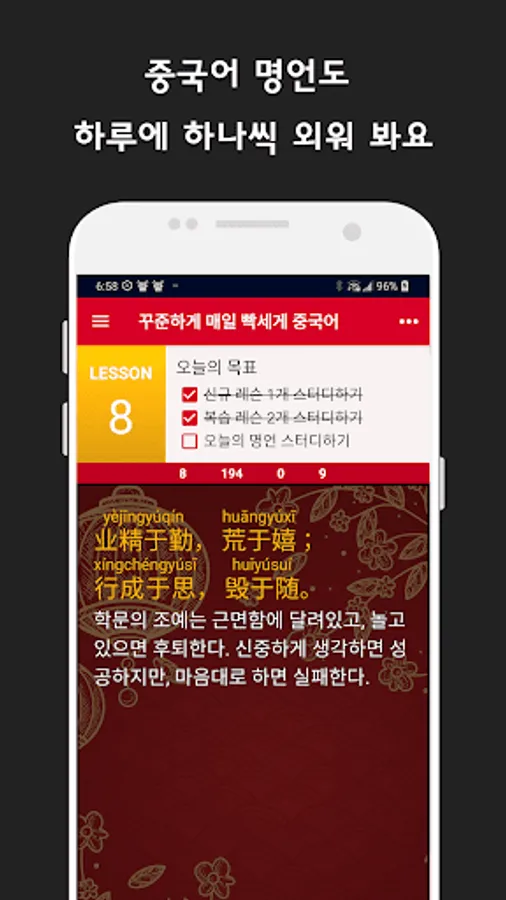 It helps you to study Chinese steadily through the alarm sent at the set time.
