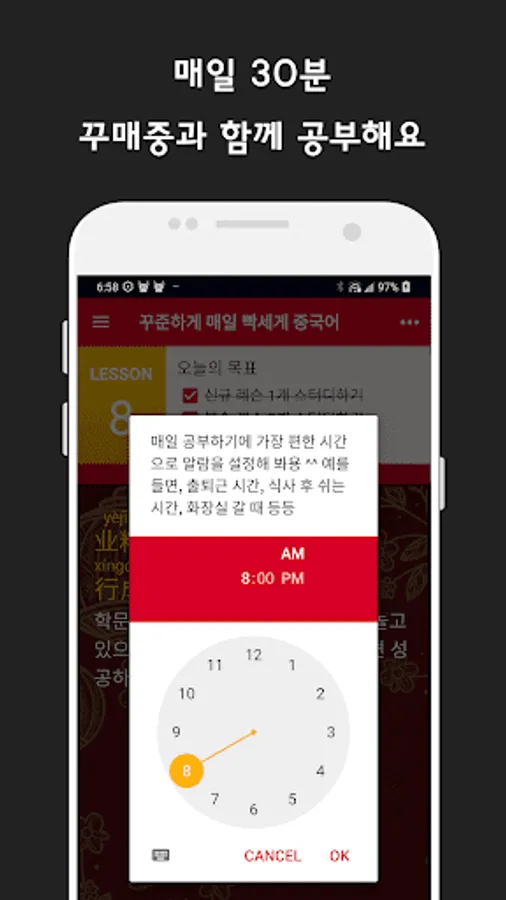▶ Send a notification at the time you set so that you can study Chinese conversation every day