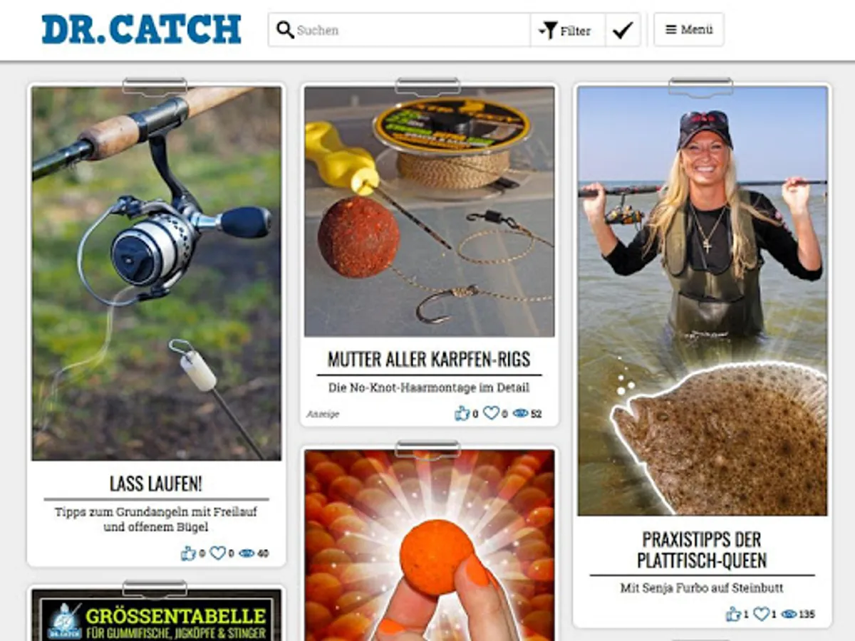 Each week you can put yourself on new, exciting reports about happy around fishing. We love to have you informed on topics that you particularly interested - but only if you also want to. Simple filter functions make the search easy to fishing methods, fish, lures, districts, nodes and montages. Your favorite items you can with one click mark as a favorite and quickly retrieve so later. Even complete filter settings ready Save: So you get displayed only the topics that interest you while fishing. Whether you predator anglers, sea anglers, carp anglers or coarse angler're there or you rather draws with the fly to the brook, the coast or the trout - Carry Dr. Catch to your personal fishing magazine!