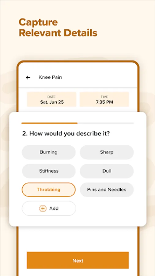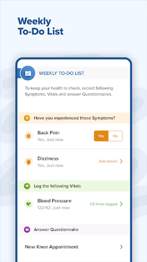 • Symptoms, Vitals, and Lifestyle Tracking - easily track your Symptoms like pain, nausea and more - with follow on questions like your doctor would ask, as well as Vitals like Blood Pressure, Weight, Sleep, etc. - to assist with diagnosis, treatment, post-surgical care, and recovery.