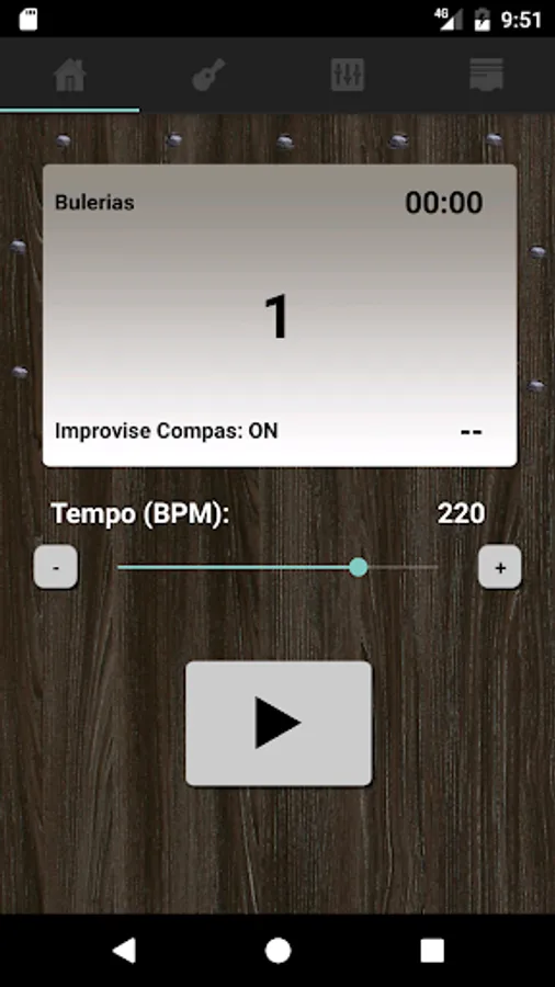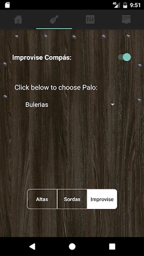 Doctor Compás is a unique flamenco metronome that never plays the same sample twice in a row, and simulates improvised palmas and cajón with incredible precision and musicality for all flamenco palos at any tempo you choose. Brought to you by Maissam Barkeshli and Jason McGuire "El Rubio", Doctor Compás is an easy to use practice tool to improve your flamenco rhythmic skills. Whether you are a guitarist, dancer or singer, student or professional, Doctor Compás can improve your rhythmic accuracy and sense of soniqueté. Install on your android device, plug into a sound system or earphones, hit the start button and play, sing or dance along.