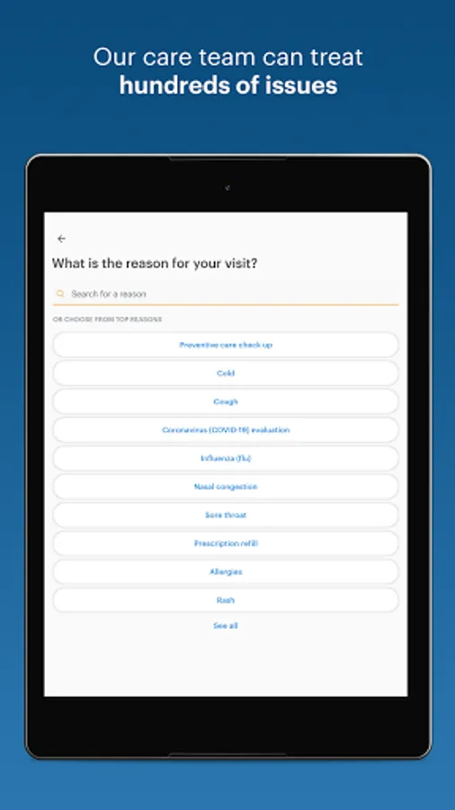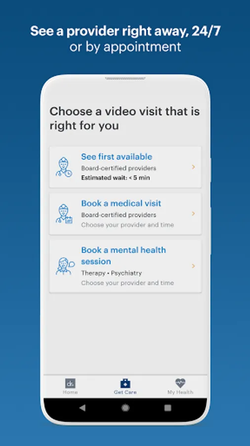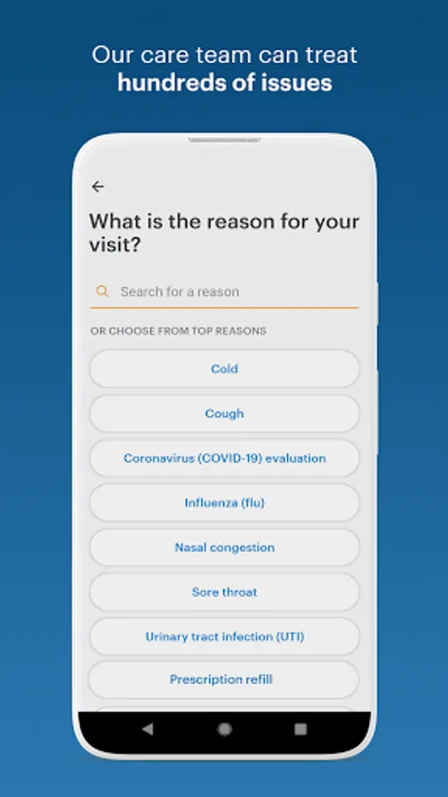 After you select the type of visit and provide your history and symptoms, you’ll meet with your provider. Your doctor may recommend lab work and treatment, including prescriptions. After the visit, you can review your visit details in your Doctor On Demand health record.
