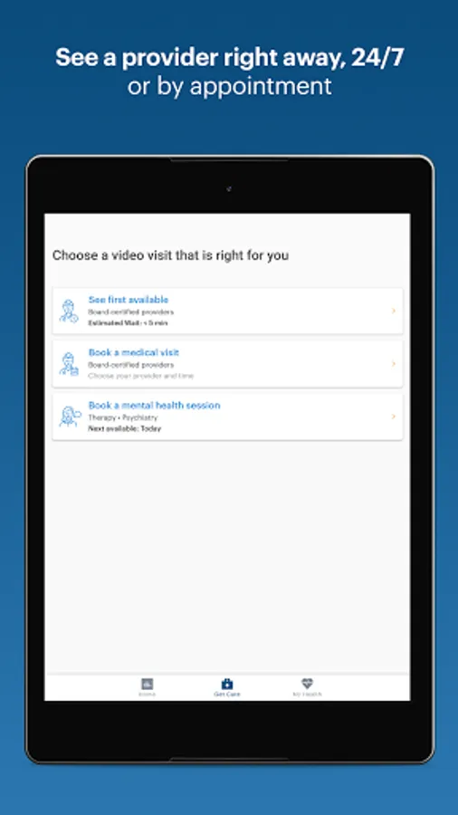Total Virtual Care™ available when you are – anytime, anywhere. Connect face-to-face with board-certified providers and licensed therapists over live video on your smartphone or tablet.