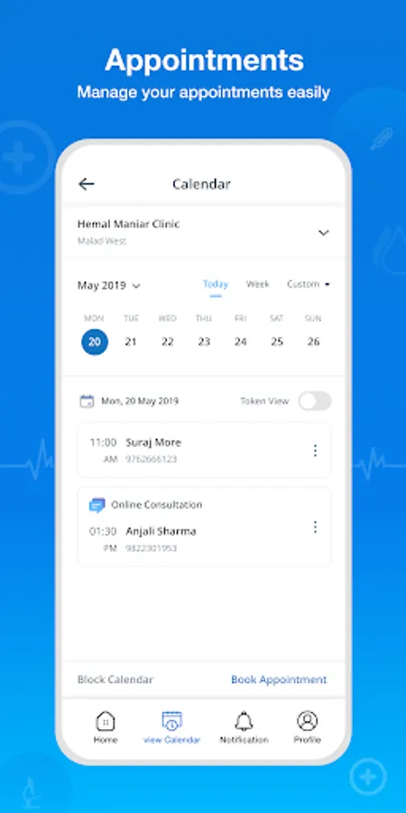 2. Consult their patients through audio/video calls or in-person appointments with systematic scheduling.