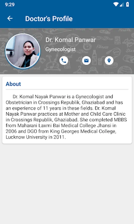 Dr. Komal Nayak Panwar is a Gynecologist and Obstetrician in Crossings Republik, Ghaziabad and has an experience of 11 years in these fields. Dr. Komal Nayak Panwar practices at Mother and Child Care Clinic in Crossings Republik, Ghaziabad. She completed MBBS from Maharani Laxmi Bai Medical College Jhansi in 2006 and DGO from King Georges Medical College, Lucknow University in 2011.