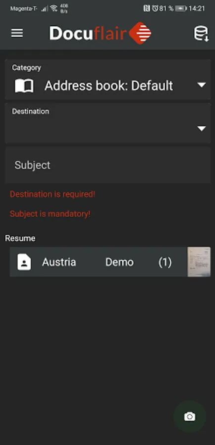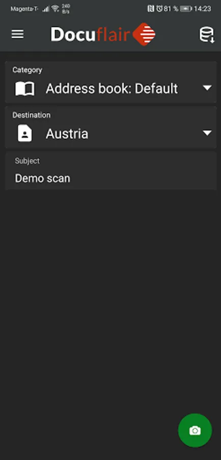The Docuflair App is particularly suitable for documentation purposes, where (recurring) recordings need to be transferred to specified target systems. The transmission of the images takes place in the background, if desired only when a connection to a WiFi is established. As an option, it is possible to enter a subject for the photos to be transmitted. The subject can also be filled automatically by photographing a QR code or barcode.