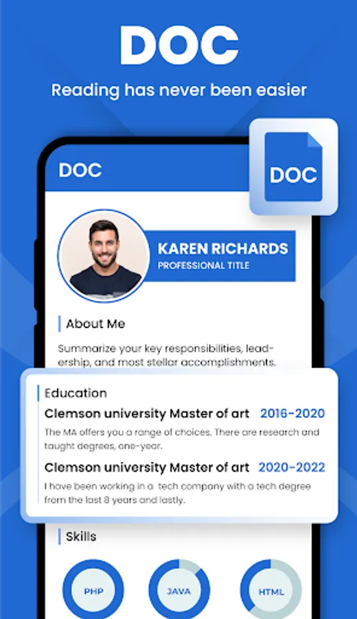 Doc Reader is a fast way of reading word documents on your device. Simple and elegant reader screen which has the essential controls. This word office reader application represent all formats of documents in the best way.