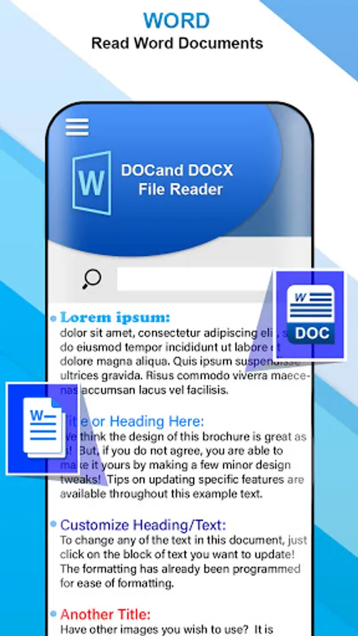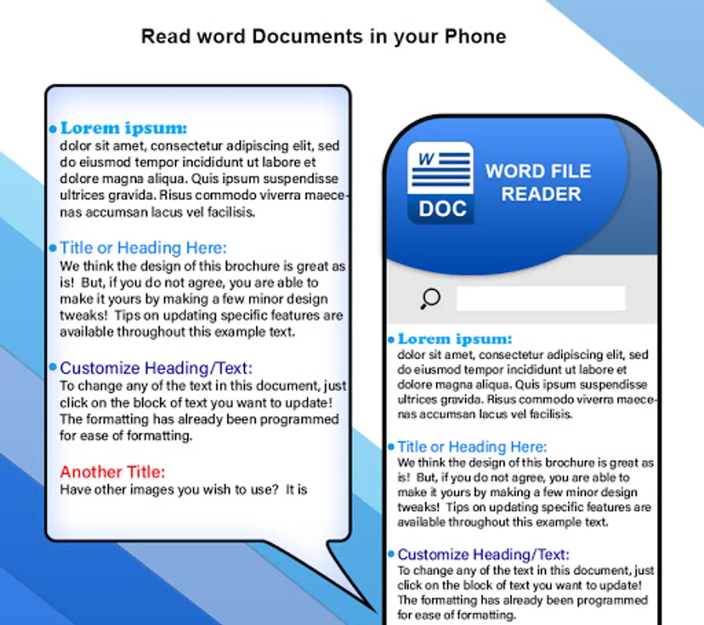 you can view all files in DOC and Docx Format in your phone now. It’s a word file opener to view all your word files in your phone instead of using PC or laptop. You can easily search documents and read in your phone now because it supports all word format files.