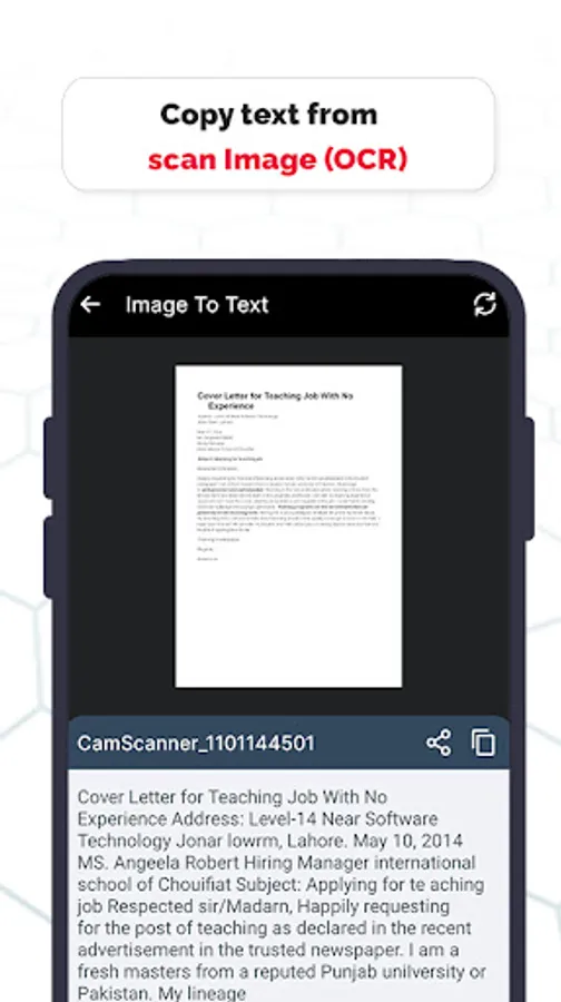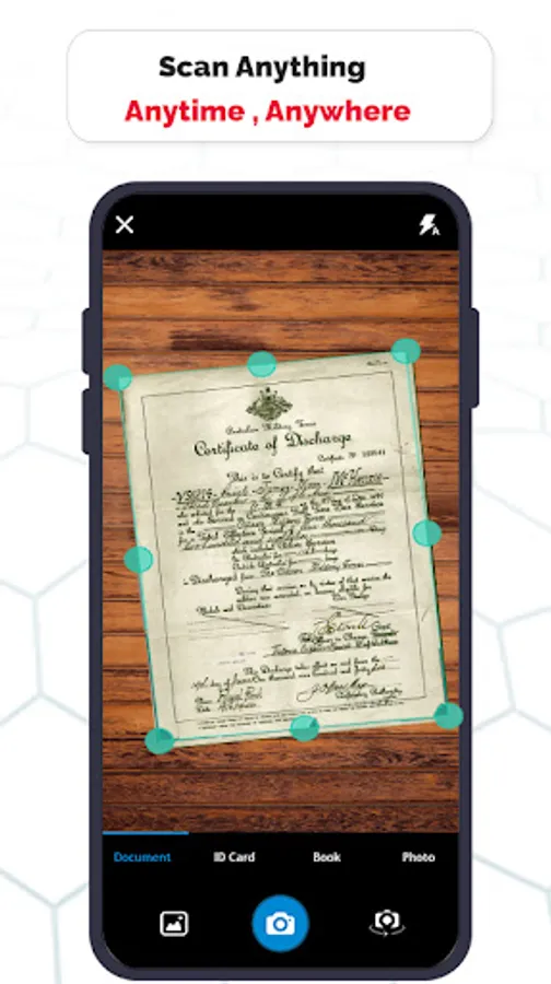 Scan two side ID Card into one file and convert it into PDF with single tap. Best Document Scanner It has all the features that a scanner should have. The OCR Text Recognition let you recognize text from images, then edit texts or share text to other apps. Remove grain/noise from old document/Image Remove Noise from old image using various advanced filter techniques and make it more clear and sharp than before. With this app, scan document and convert images to document the easiest way. Flashlight This scanner app also have Flashlight feature that helps you in taking scans in low-light environment.