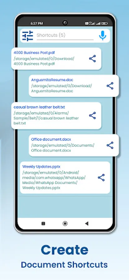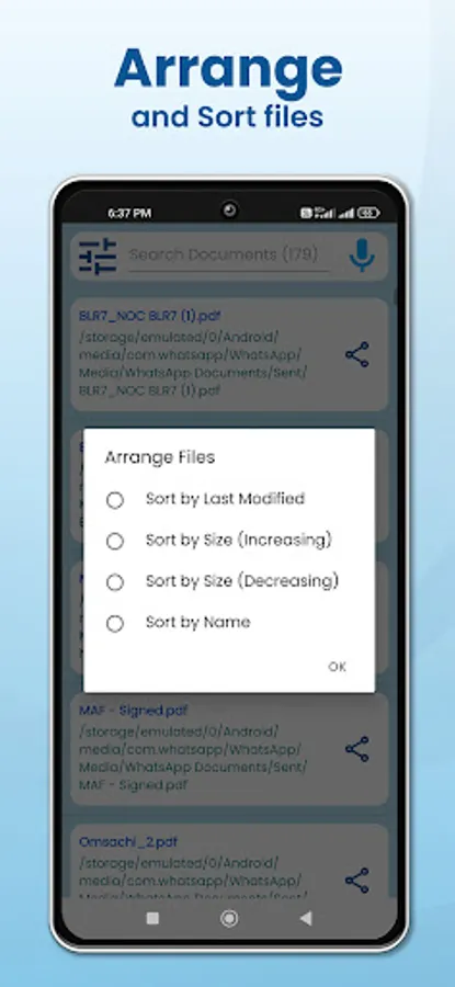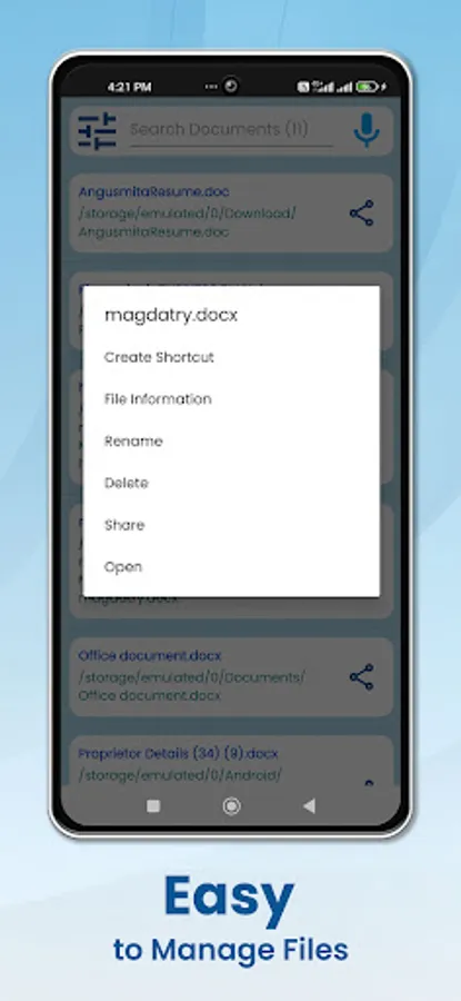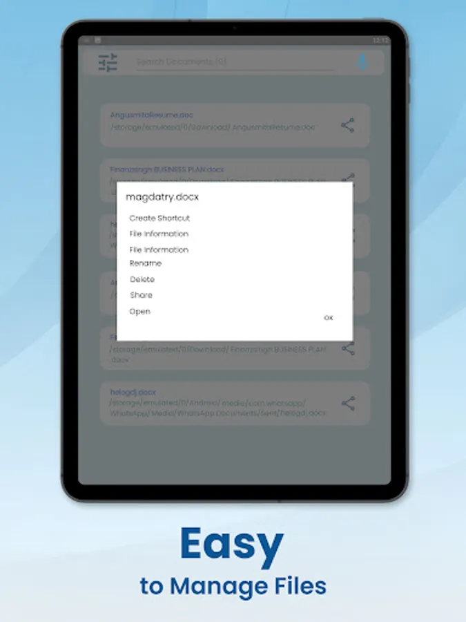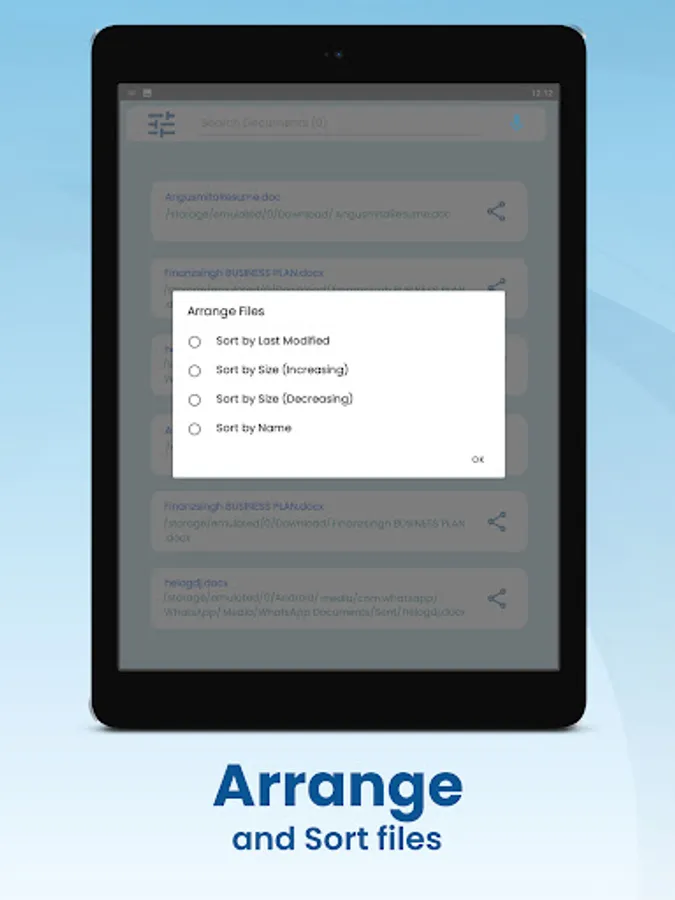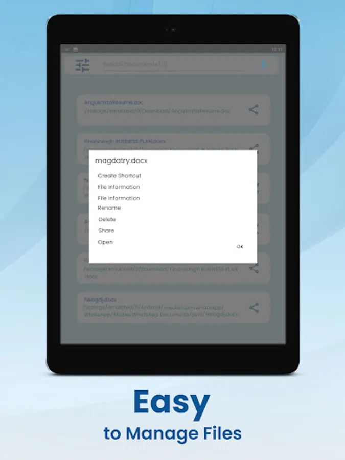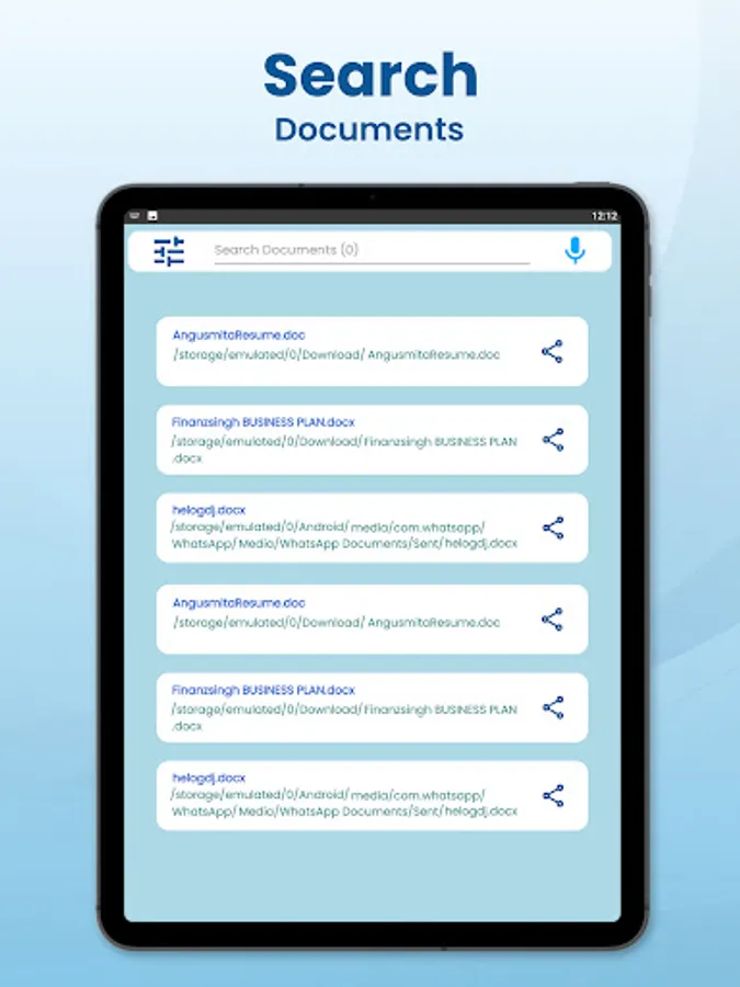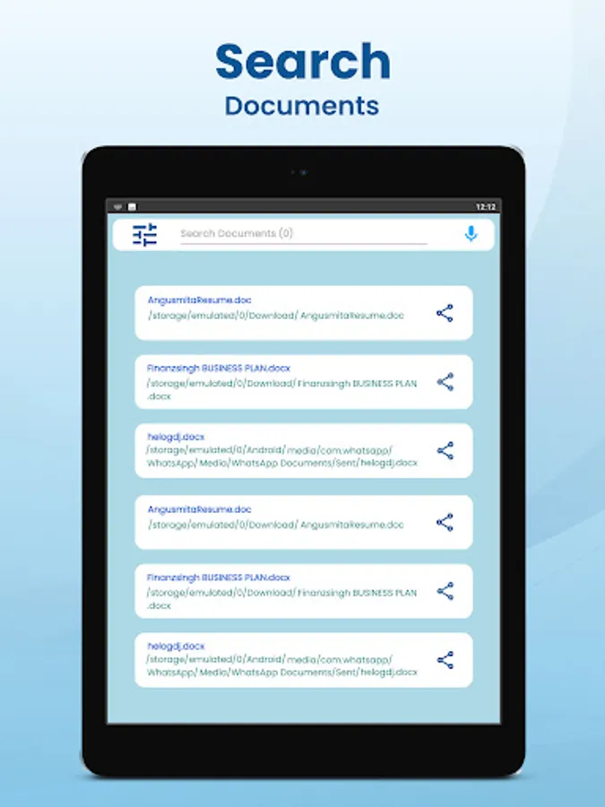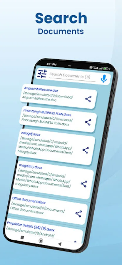 3. You don't have to search for files in different folders of your file manager app, this app shows you to browse or view all the files in one place as a list of documents such as docx, doc, pdf, ppt, pptx, xlsx or text files.