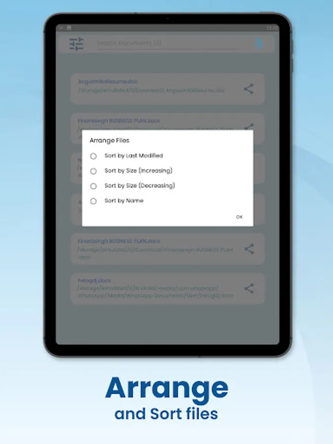 9. With this smart office file reader, you can SEARCH files including using Voice Recognition and browse all documents in a smart documents list for multiple document files formats like word files (.doc or .docx), open .pdf, .xlsx viewer, read .ppt and .txt files. Use this document manager app to Organize files with sorting options.