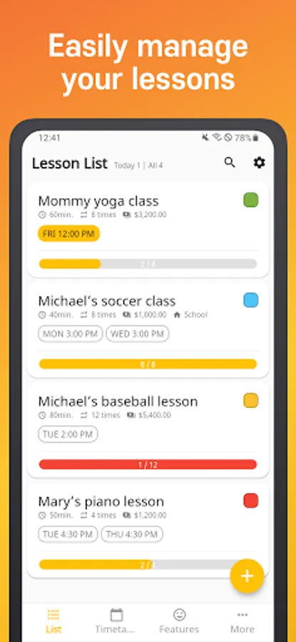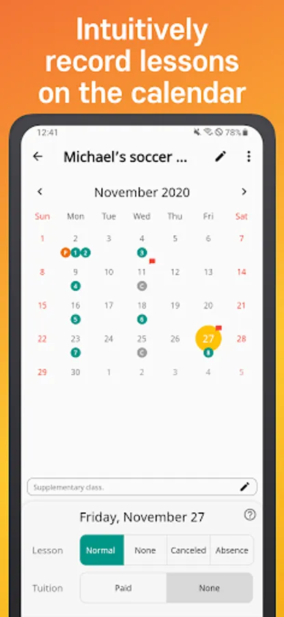 Lesson note are also useful for teachers. Teachers can intuitively manage many children's lessons at the same time and different tuition payment dates. Easily find the available time with the timetable.