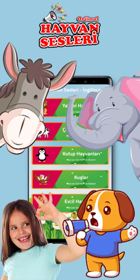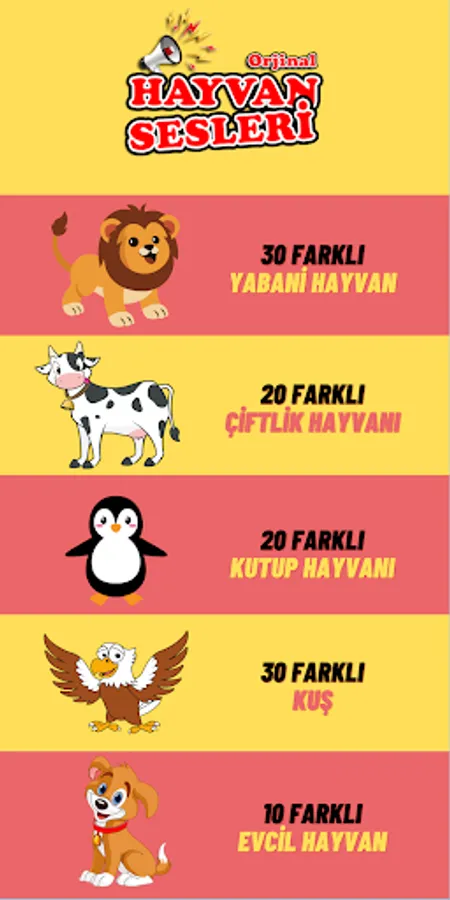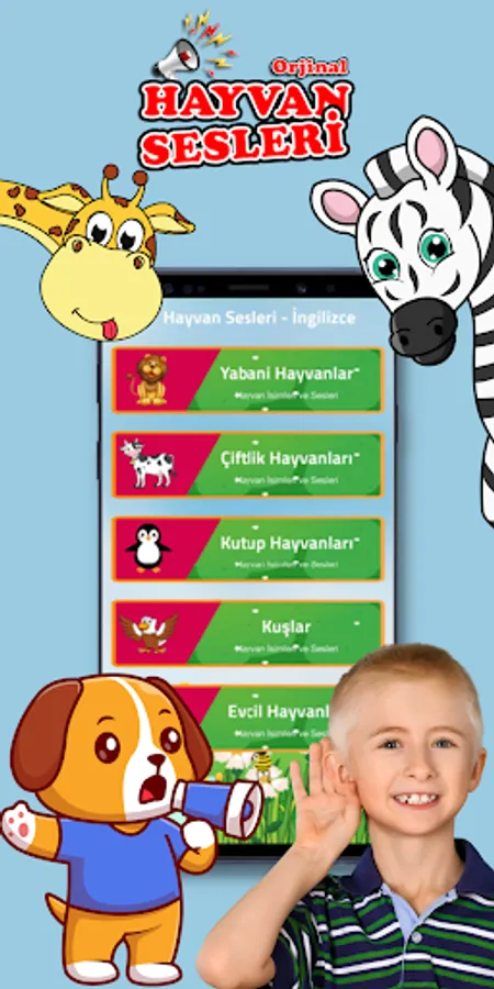 In our application, a total of 106 different animals' original animal sounds, Turkish names and cartoon-style character images suitable for children are included in 5 different categories.