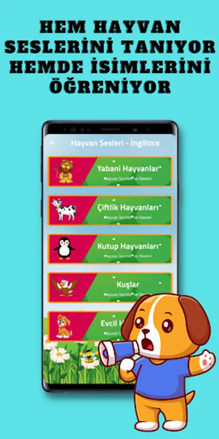 - Pets category includes the original sounds and Turkish names of 10 different animals.