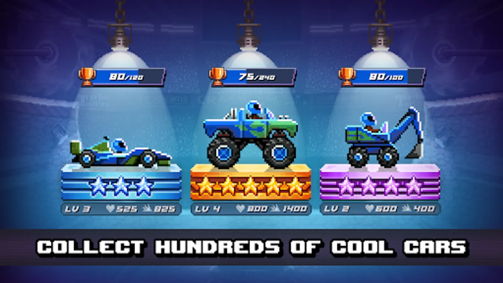 Hundreds of pixel cars, helmets, levels, missions, and game modes bring endless hours of helmet-crashing two-player racing action with freak accidents!