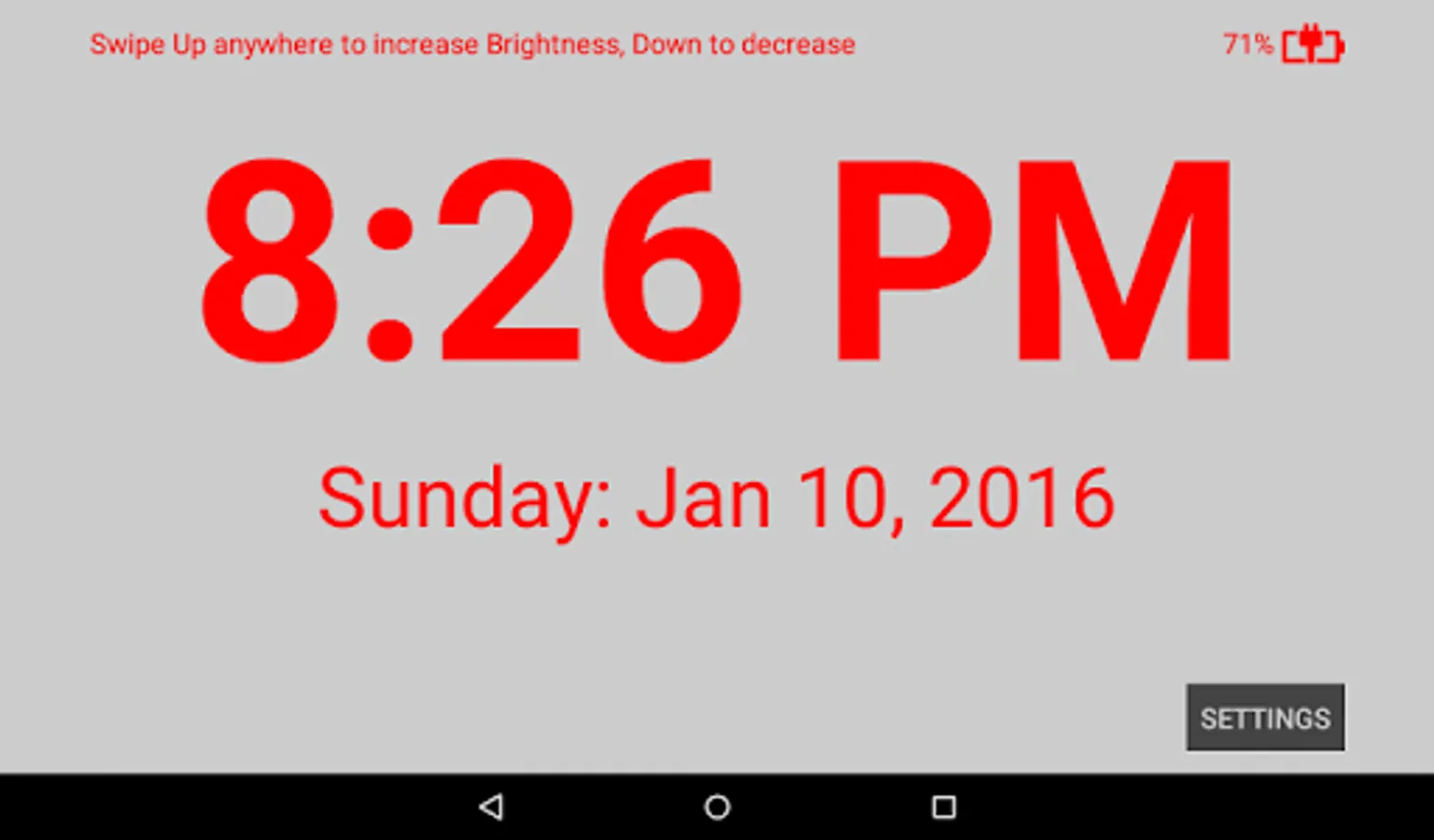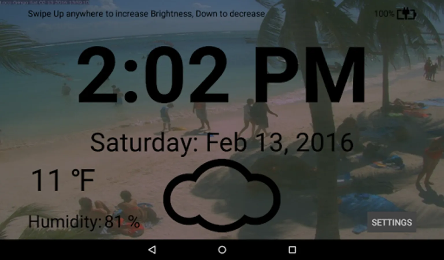 Version 1.5 was a major update. Users can now change the background to an image, selecting a local image from the device, or an internet URL image (example webcam I like: http://107.170.253.177/akumal/netcam-0.jpg). Current weather conditions are now displayed as well (requires location services enabled). Also, added in alarm functionality (using default android alarm provider).