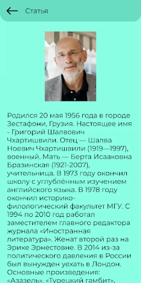 Big Writer is an app for reading articles about famous writers and poets. It is intended for anyone who is interested in literature and wants to learn more about the life and work of famous authors. The application is a convenient and intuitive interface that allows you to quickly and easily find the article you are interested in.