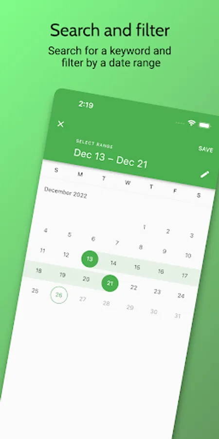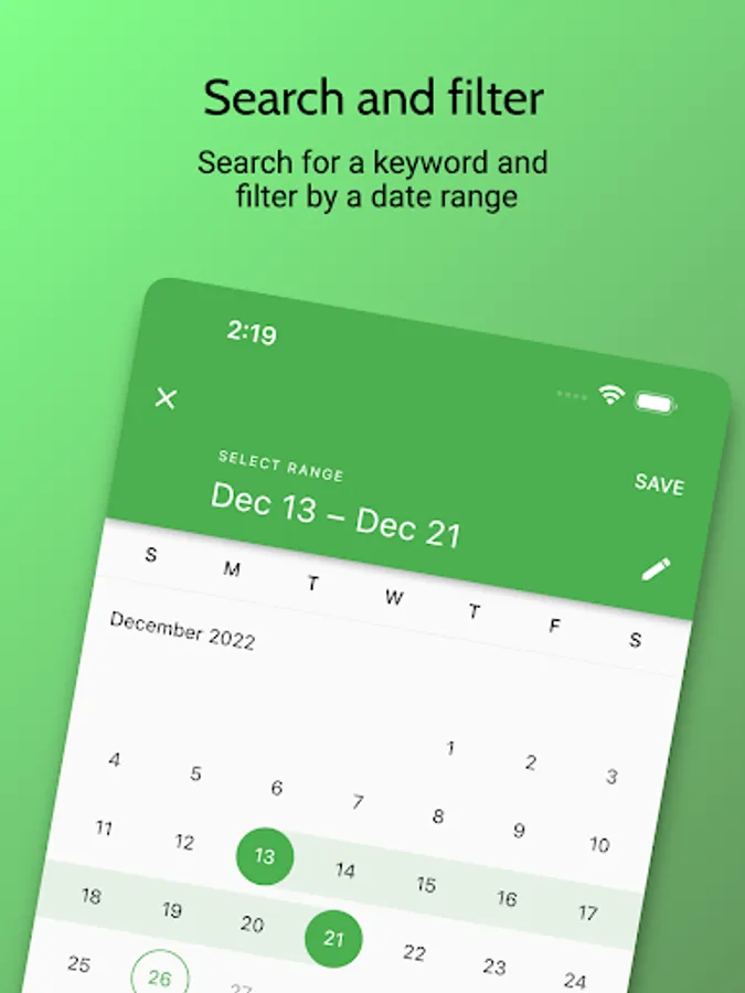 - Keyword search and date-range filter.