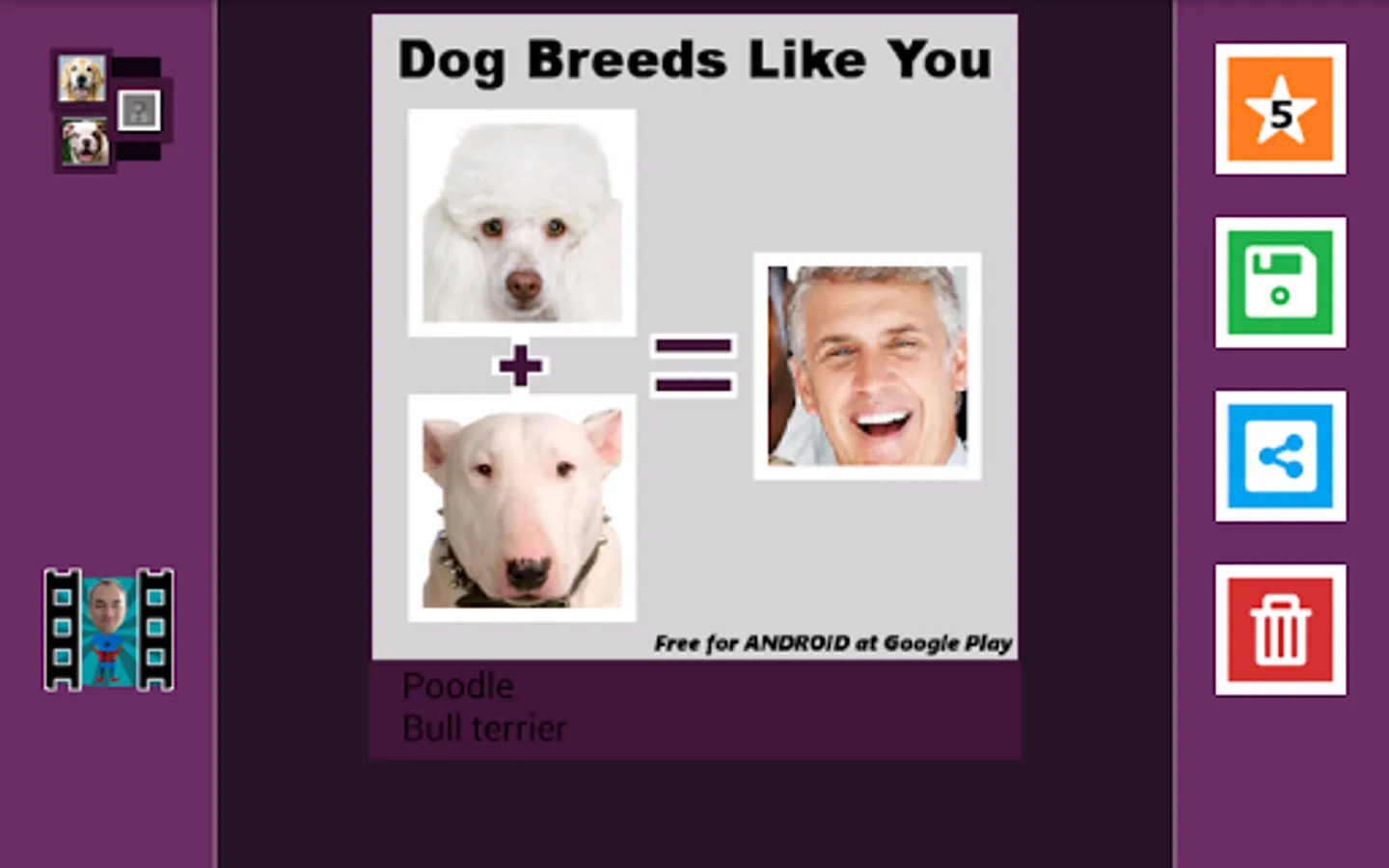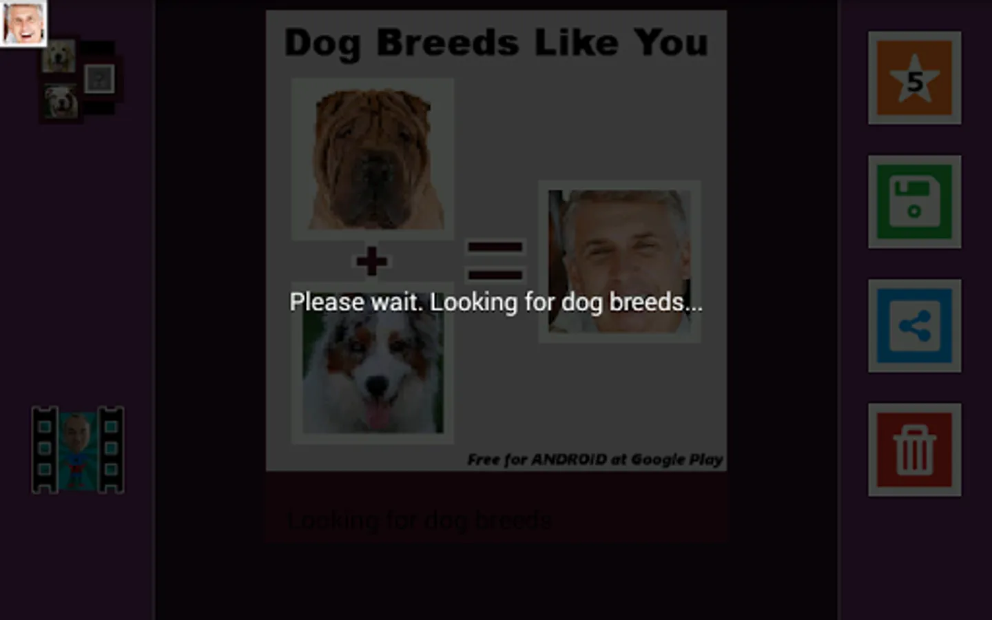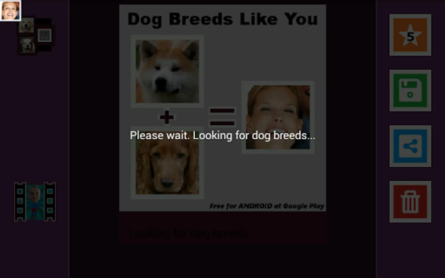 Find out which dog breeds most look like you (look alike)! Upload any photo or picture saved in your cell phone or tablet memory and find out! Select friends in Pictures and share the results on facebook or whatsapp!
